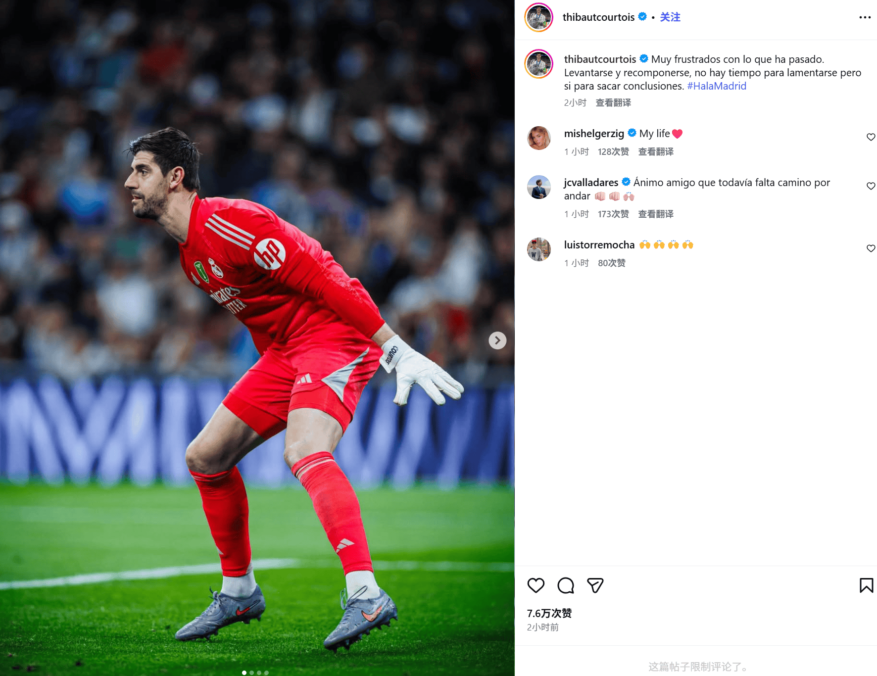 输给塞尔塔后库尔图瓦发文:深感失望,要汲取教训继续前行
