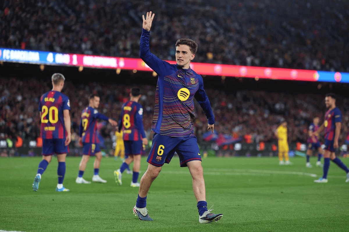 致敬皮克经典动作,加维向看台比四手指庆祝战胜西班牙人