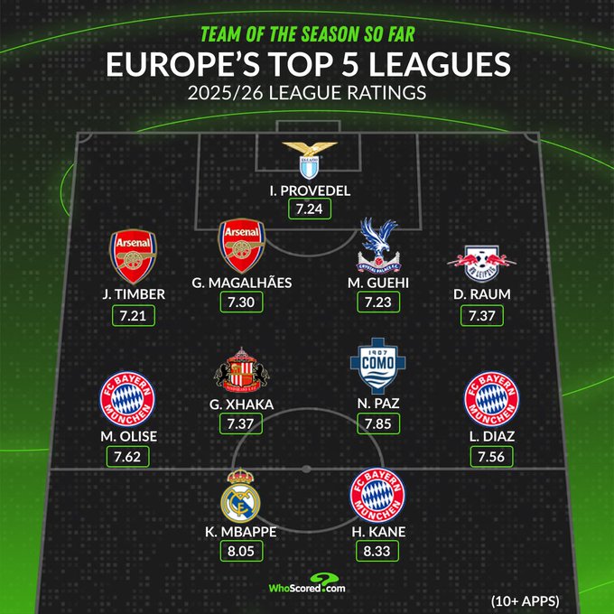 WhoScored本赛季至今五大联赛最佳阵容:姆巴佩、凯恩领衔