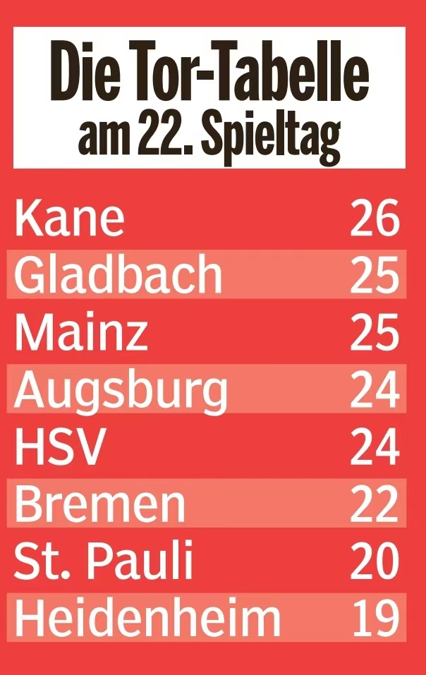 凯恩本赛季德甲进26球,超7家德甲球队进球数