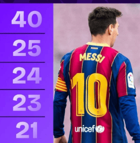 40个,梅西是近9季五大联赛中禁区外射门进球最多的球员
