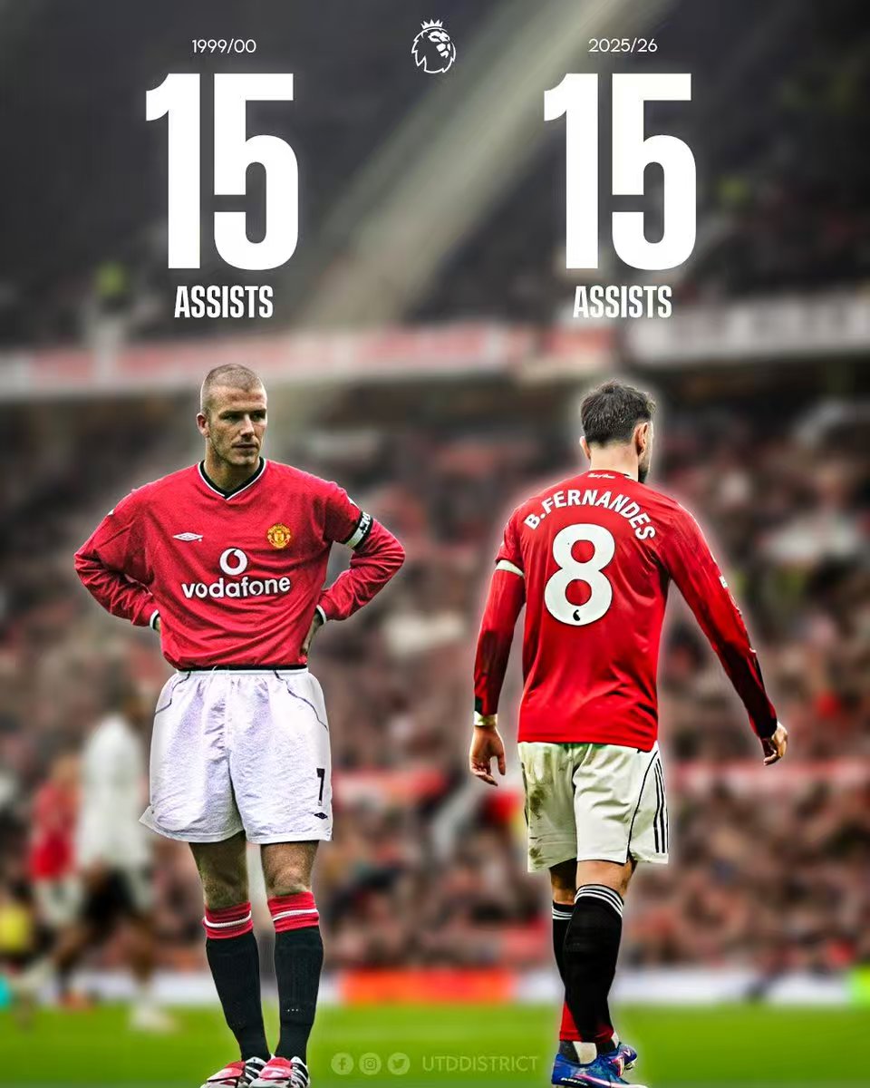 追平传奇!B费本赛季英超助攻达15次,追平贝克汉姆队史纪录