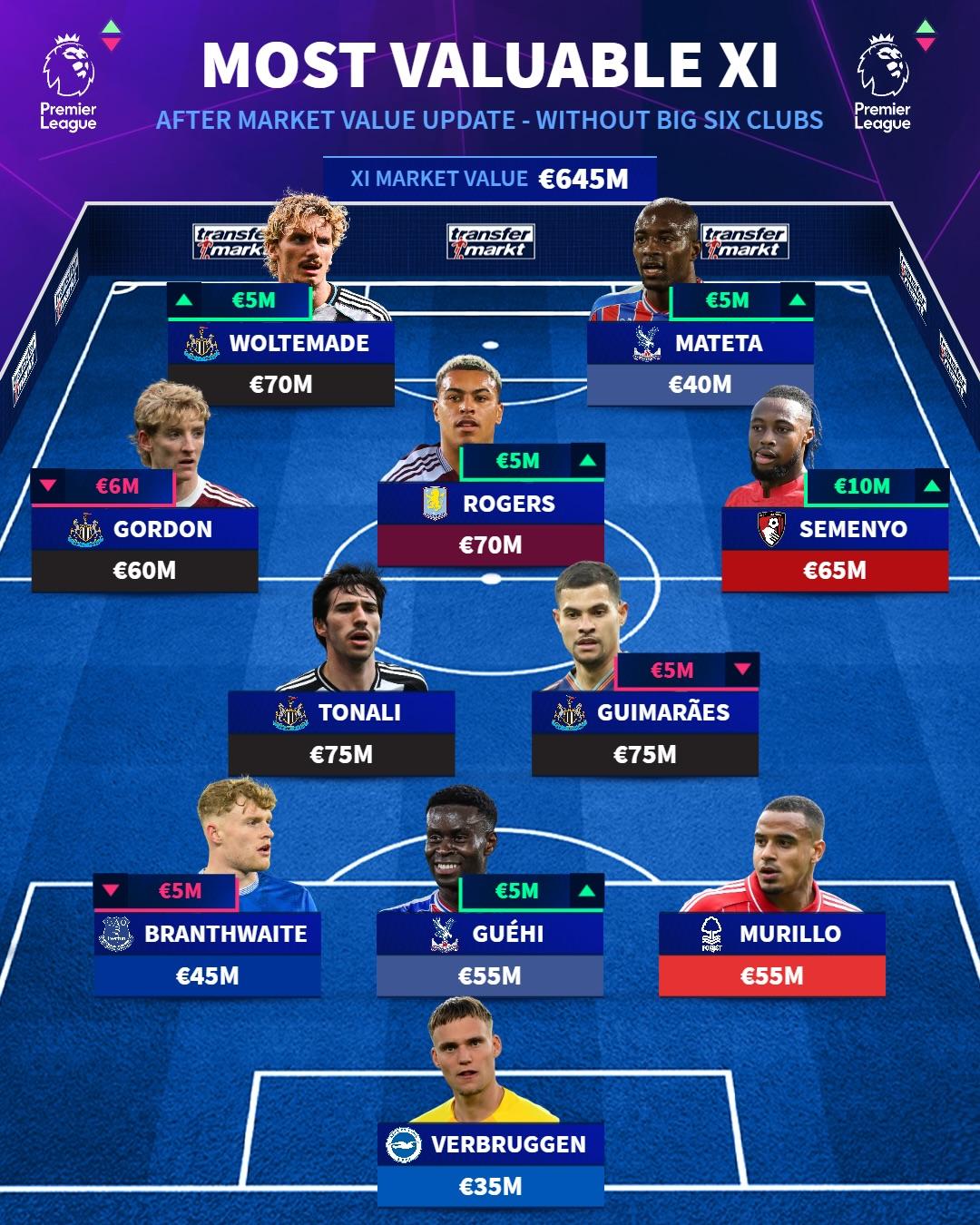 德转英超除BIG6外最贵阵容:托纳利领衔纽卡4人在列