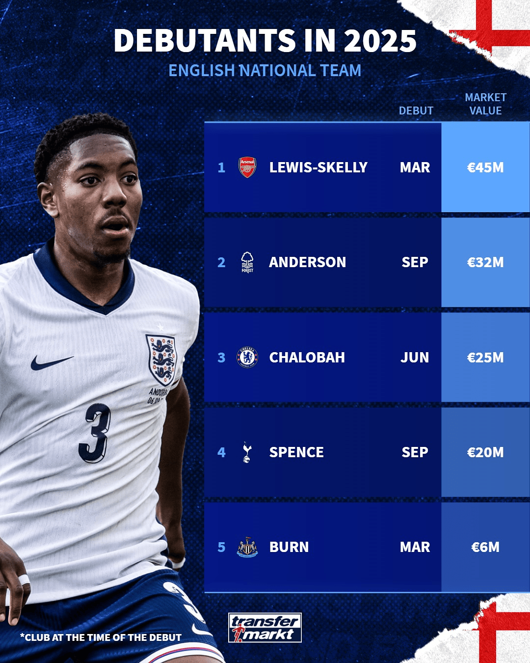 2025年英格兰国家队新人身价榜:斯凯利居首,安德森第二