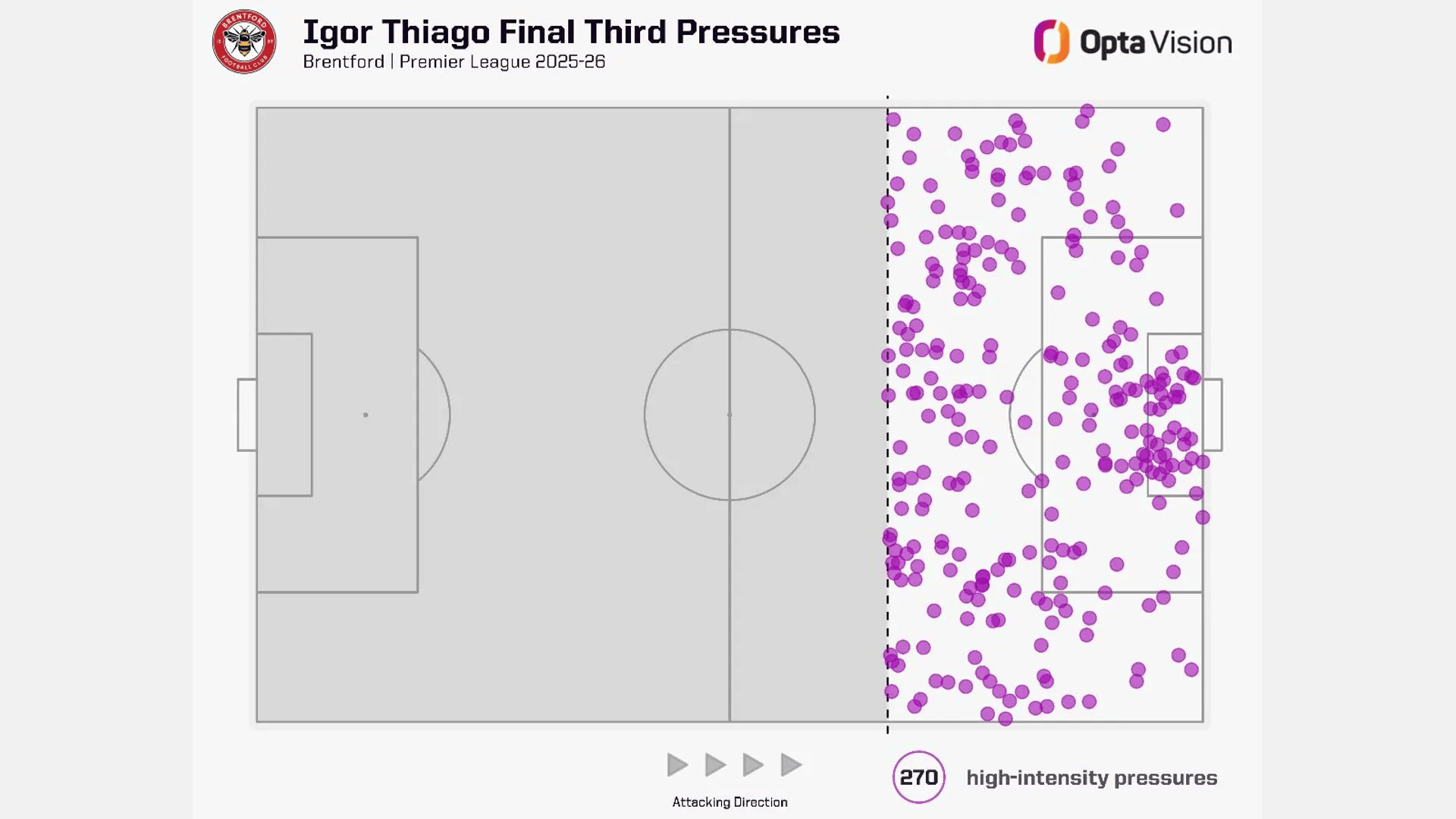 伊戈尔-蒂亚戈本赛季英超609次高压逼抢,进攻三区270次居首