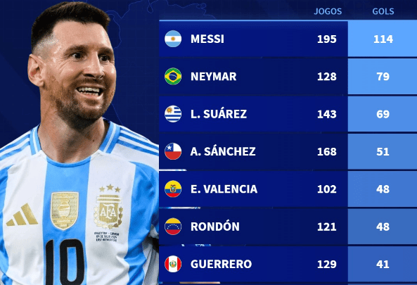 南美各国历史射手王:梅西114球居首,内马尔、苏亚雷斯在列