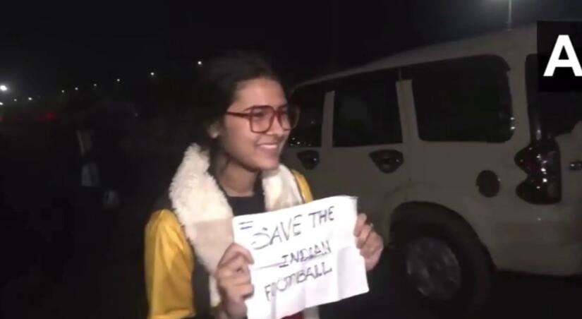 一印度女球迷接机时手举标语:梅西,拯救印度足球