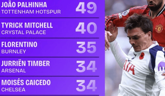 本季英超完成30+铲球的球员中,廷贝尔成功率最高,为89.5%
