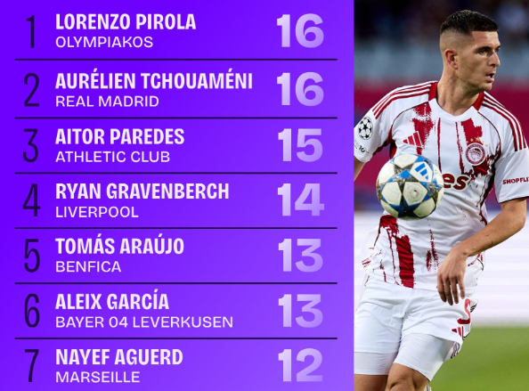 本赛季欧冠拦截榜:皮罗拉、琼阿梅尼16次并列居首