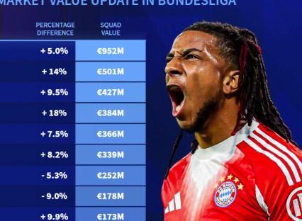 德甲俱乐部身价榜:拜仁9.52亿欧居首,多特,药厂分列二三