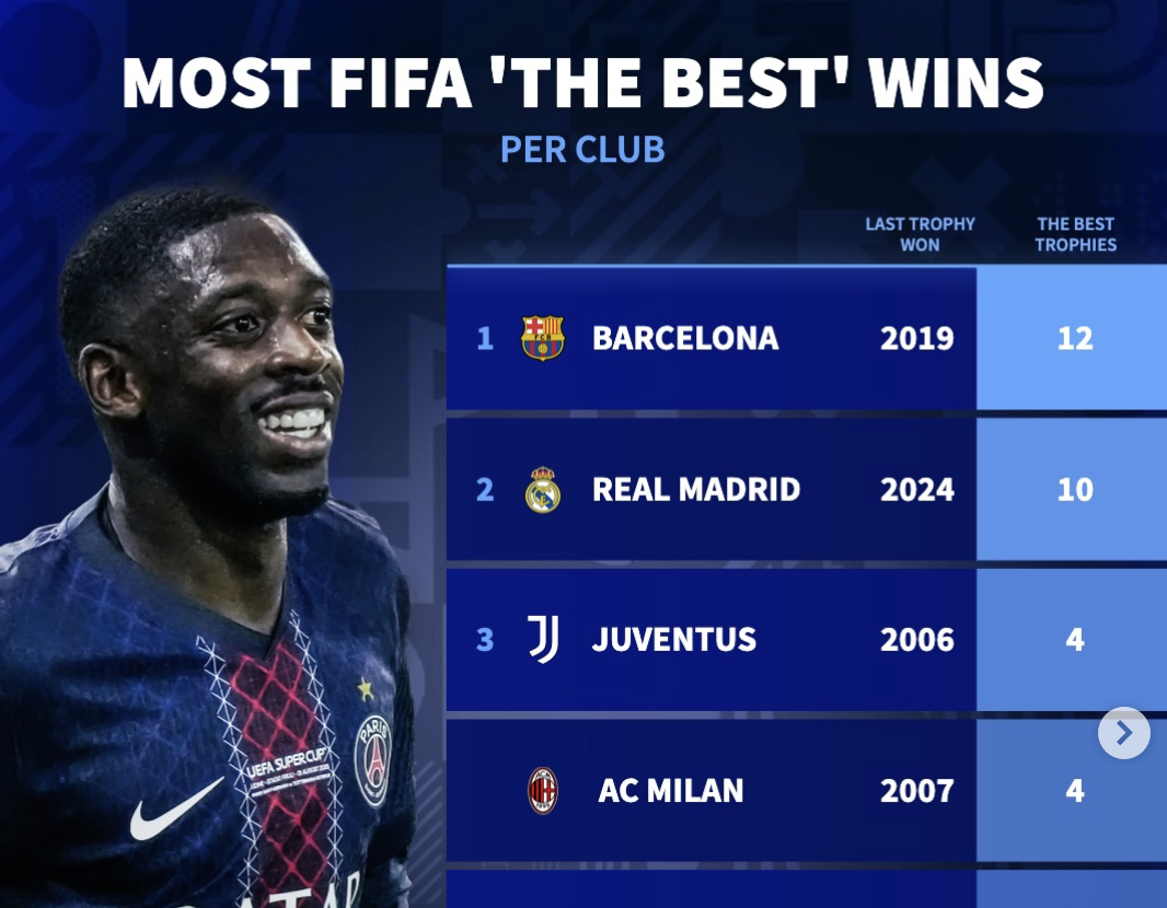 获FIFA年度最佳球员所在俱乐部榜:巴萨和皇马排名前二