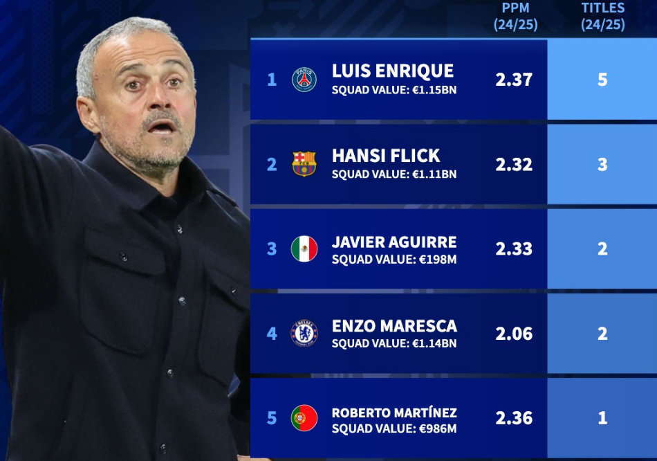 FIFA年度最佳教练上赛季成绩:恩里克5冠在手,场均积分2.37