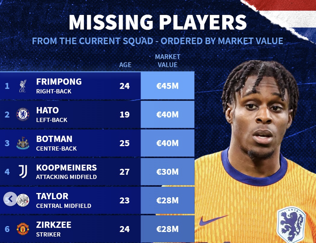 落选本期荷兰队球员身价榜:弗林蓬、哈托和博特曼排名前三