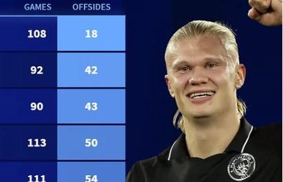 自22/23赛季顶级前锋联赛越位次数榜:哈兰德108场18次最少