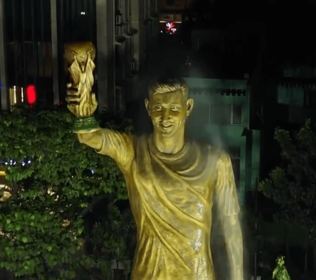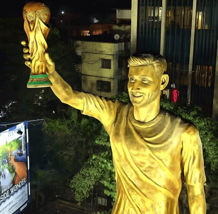 高规格接待,印度加尔各答新建21米手持世界杯梅西雕像