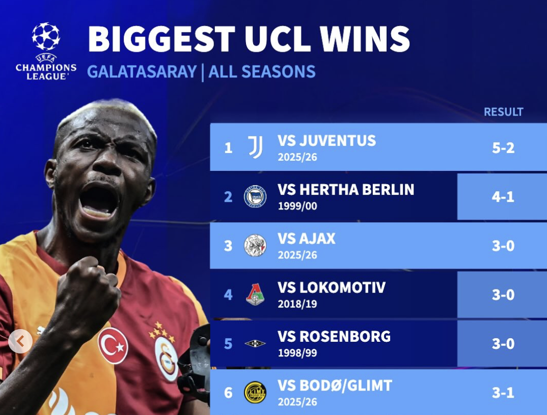 加拉塔萨雷欧冠最大获胜比分榜:5-2胜尤文图斯排队史第一