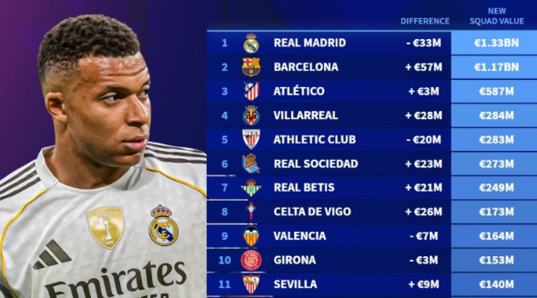 西甲球队身价变化:巴萨上涨5700万欧,皇马下跌3300万欧