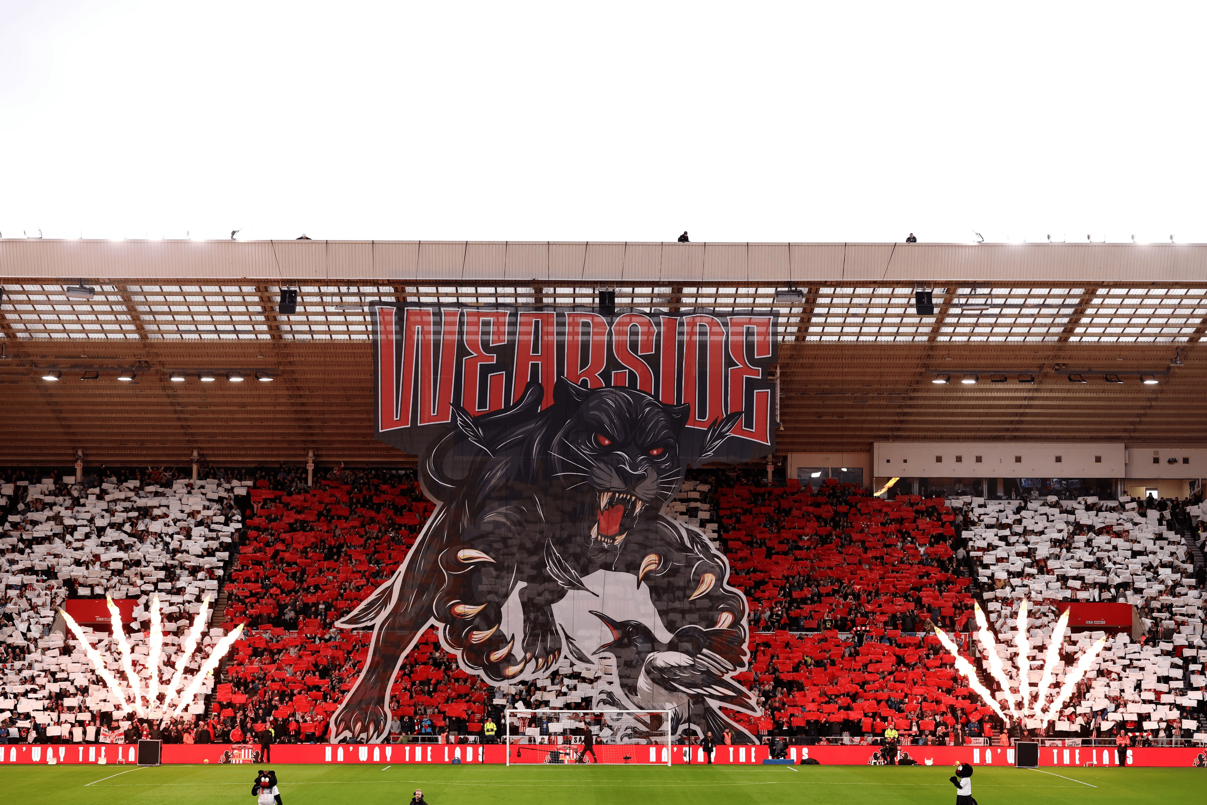 东北德比火药味拉满:黑猫撕咬喜鹊巨幅TIFO亮相桑德兰主场