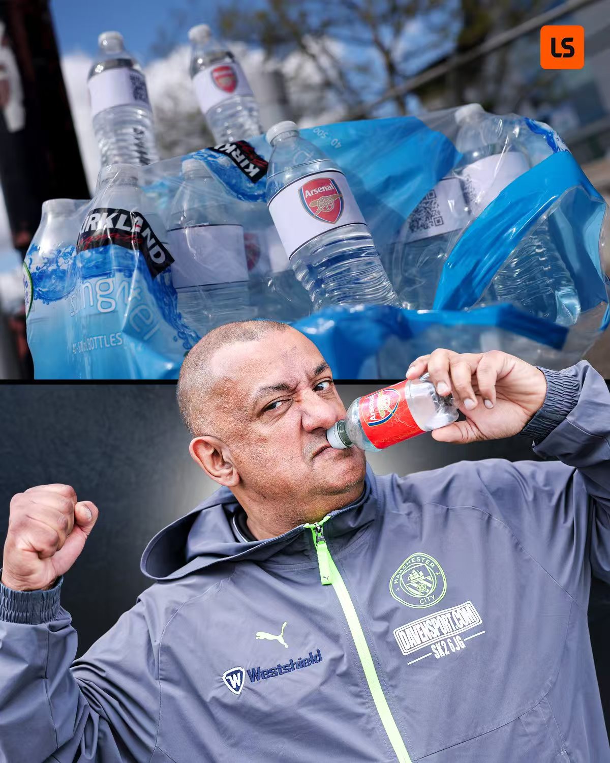 整活!曼城“水瓶”哥赛前在球场外售卖有阿森纳标志的水