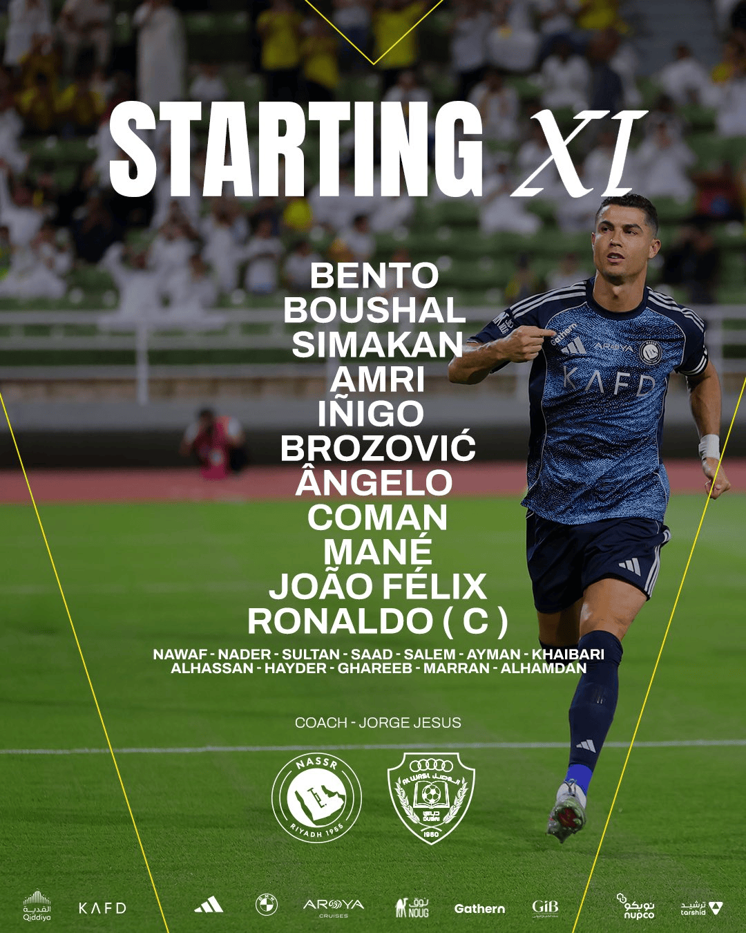 胜利vs迪拜祈祷首发:C罗领衔,费利克斯、马内、科曼出战