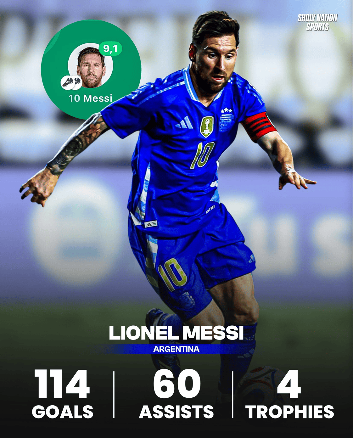 梅西国家队生涯114球60助+4冠,职业生涯1129场参与1284球
