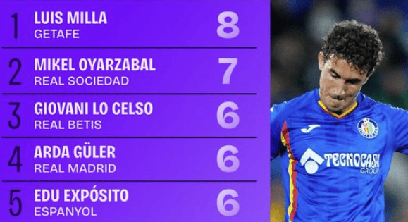 西甲本赛季创造重大机会榜:居莱尔、小蜘蛛、洛塞尔索登榜