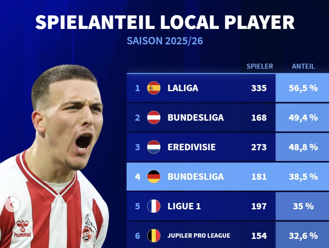 各大欧洲联赛本土球员占比:西甲56.5%居首;英超24.6%第十
