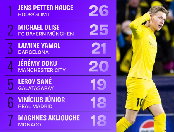 本赛季欧冠过人榜:海于格26次居首,奥利塞、亚马尔位列前3