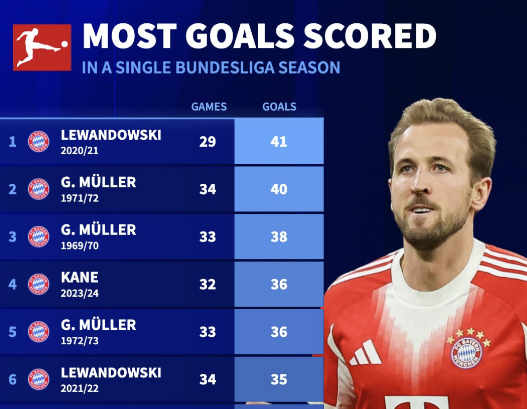 德甲单季射手王排行:莱万29场41球居首;本季凯恩已第11位