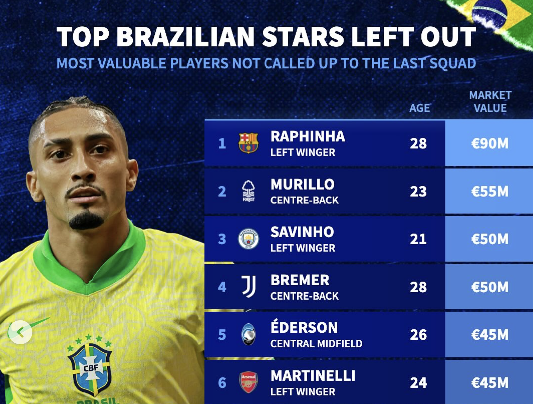 落选最新一期巴西国家队球员身价榜:拉菲尼亚9000万居首