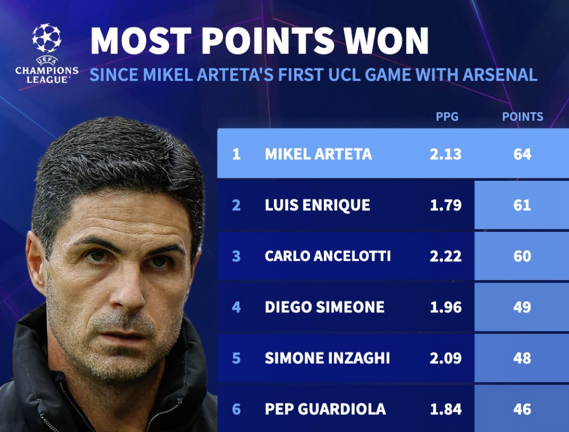 自塔帅带队参加欧冠以来教练欧冠积分榜:塔帅共64分居首