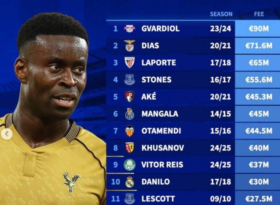 曼城队史引进的最贵中卫:格瓦迪奥尔居首,格伊排名第12