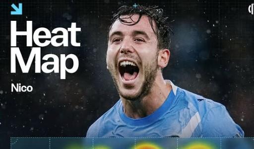 曼城官方晒尼科对阵利物浦活动热区图:中场统治力💪