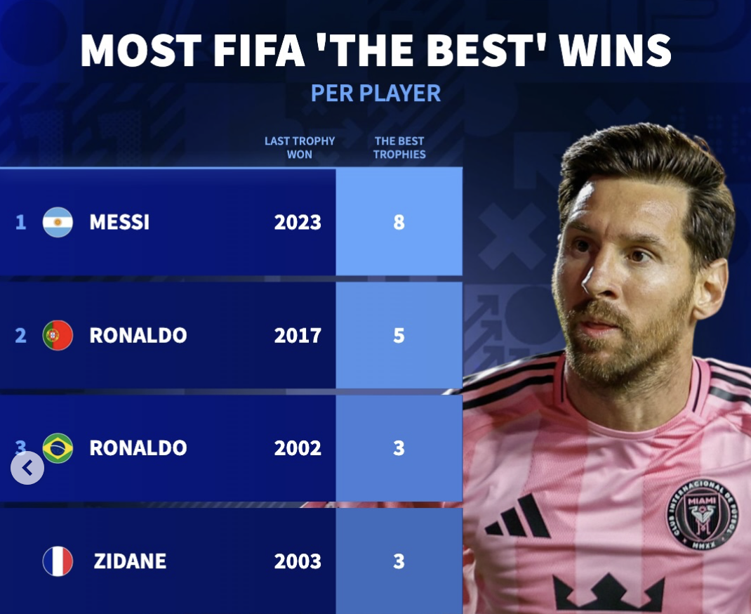 获FIFA年度最佳球员次数榜:梅西8次居首;C罗5次排第二