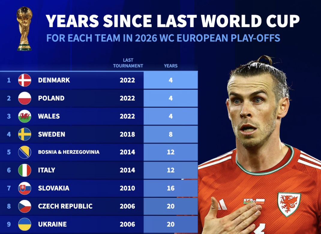 世欧预附加赛球队上次出线距今:意大利12年;土耳其24年
