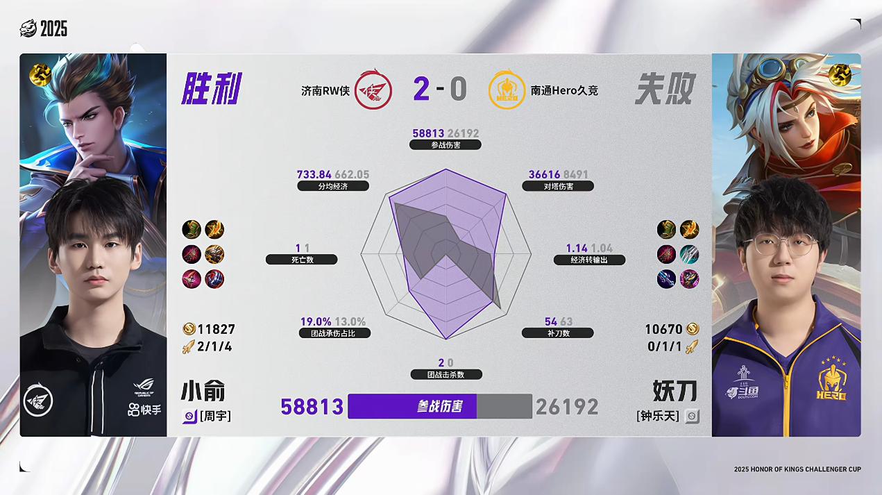 RW/Hero第2局数据对比:小俞几乎全包妖刀,妖刀补刀数领先