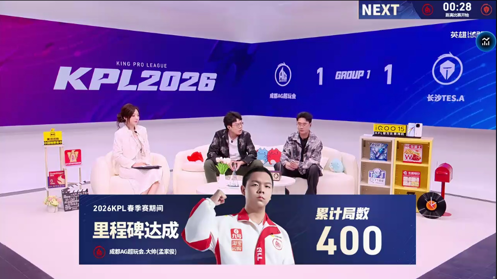 第二局比赛中,成都AG超玩会.大帅达成里程碑:400累计局数