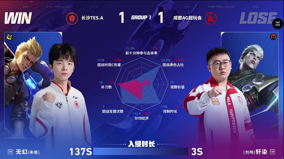 AG/TES第一局数据对比:大帅鲁班大师开团成功率高达百分百