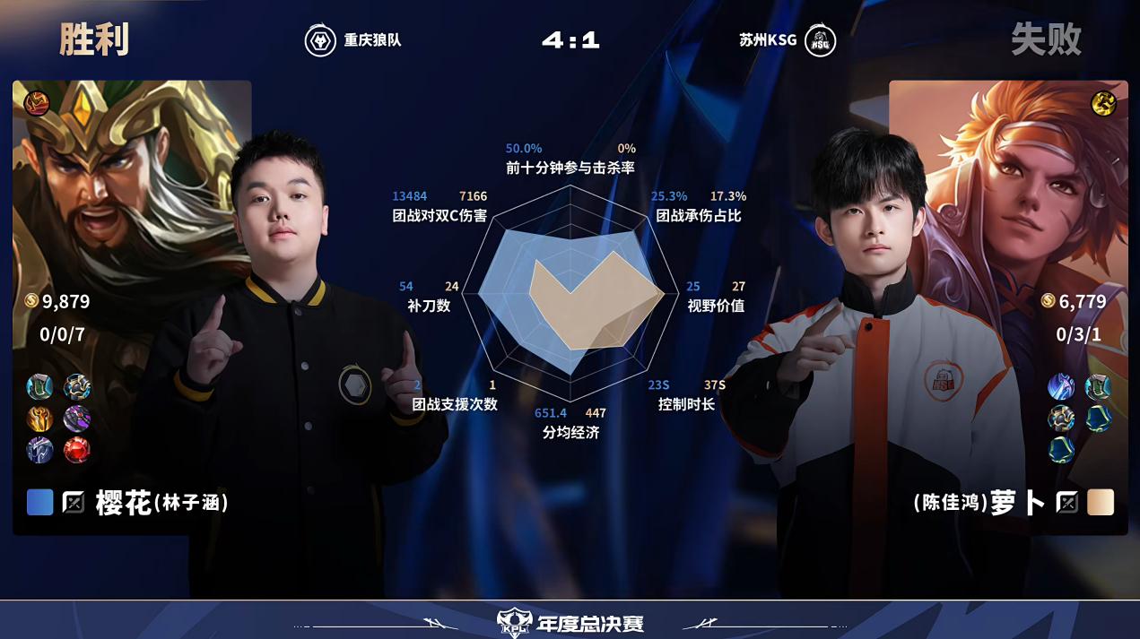 狼队/KSG第5局数据对比:樱花关羽雷达图领先萝卜孙策