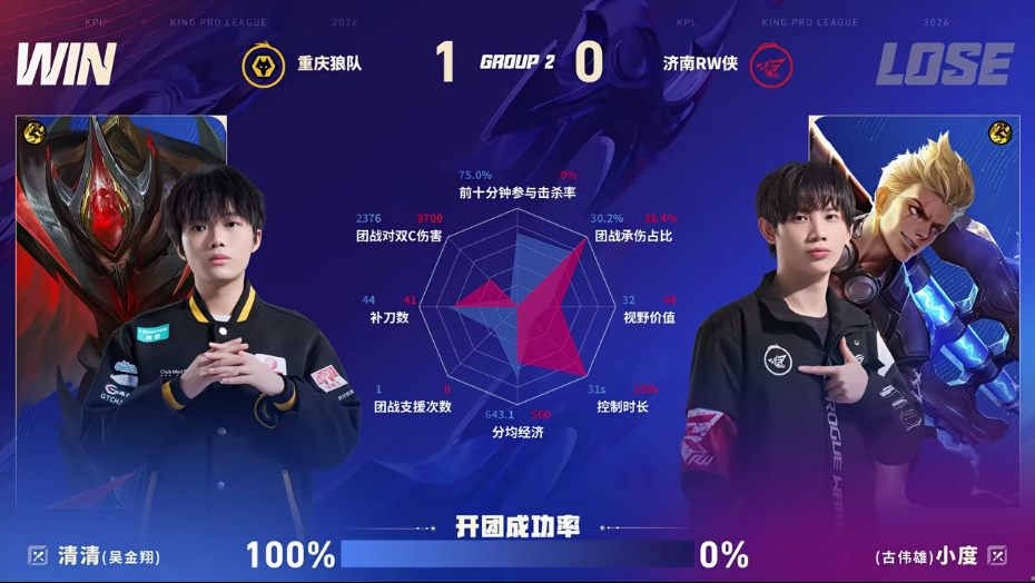 狼队/RW第一局数据图:清清白起开团成功率百分百