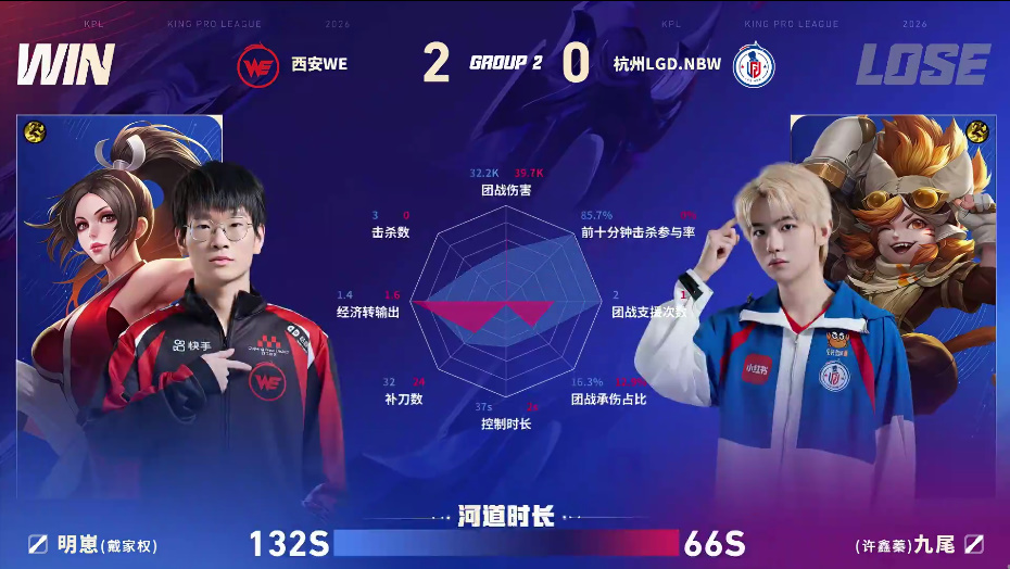 WE/LGD第二局数据图:明崽不知火舞前十分钟击杀参与拉满