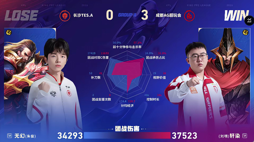 AG/TES.A第三局数据对比:小凡西施开团成功率高达百分百