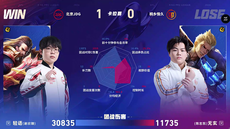 情久/JDG第一局数据对比:无双夏侯惇开团成功率高达百分百