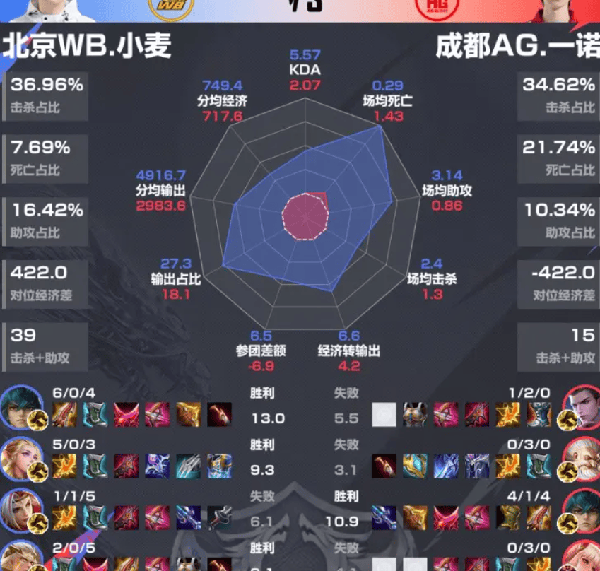北京WB4-3成都AG赛后雷达图,哪组对位差距最大?