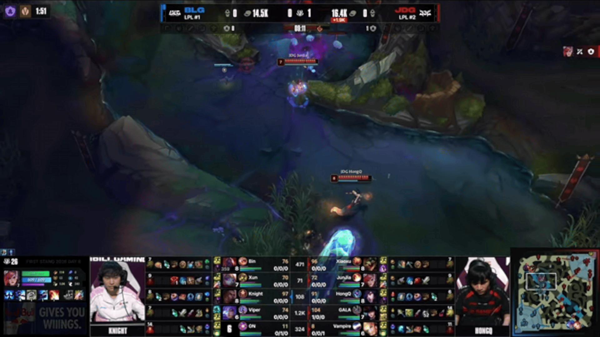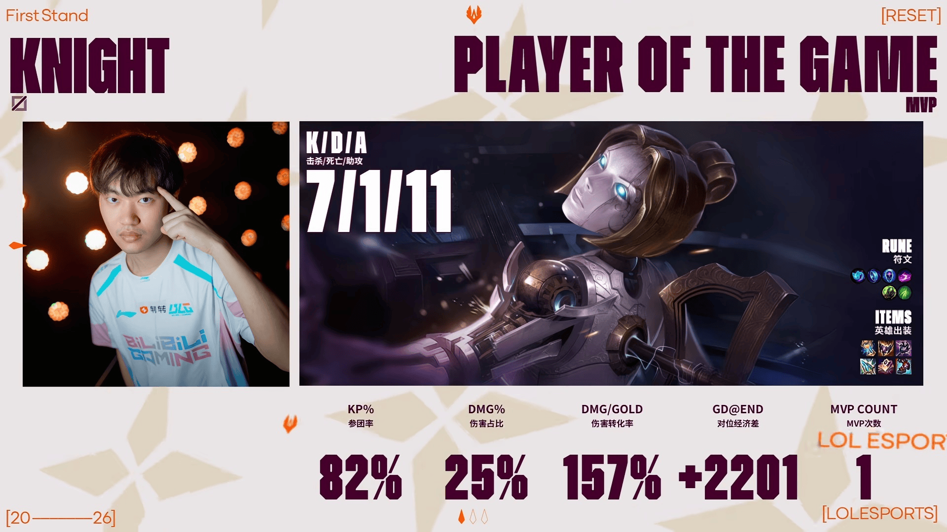 knight发条砍下7/1/11的战绩,拿下BLG对阵JDG首局MVP
