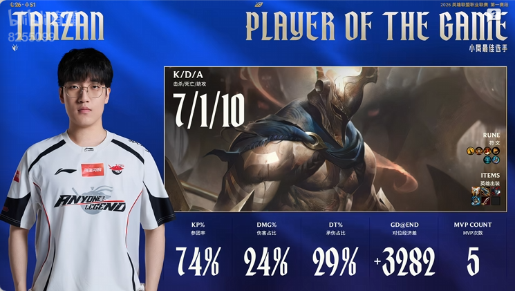 Tarzan潘森打出7/1/10战绩,拿到AL对阵TES首局MVP