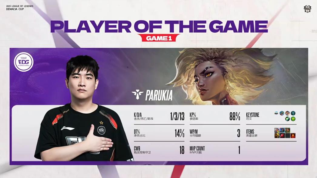Parukia芮尔打出1/3/13战绩,斩获EDG对战WE首局MVP