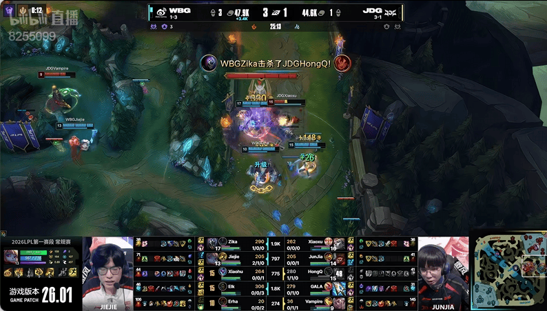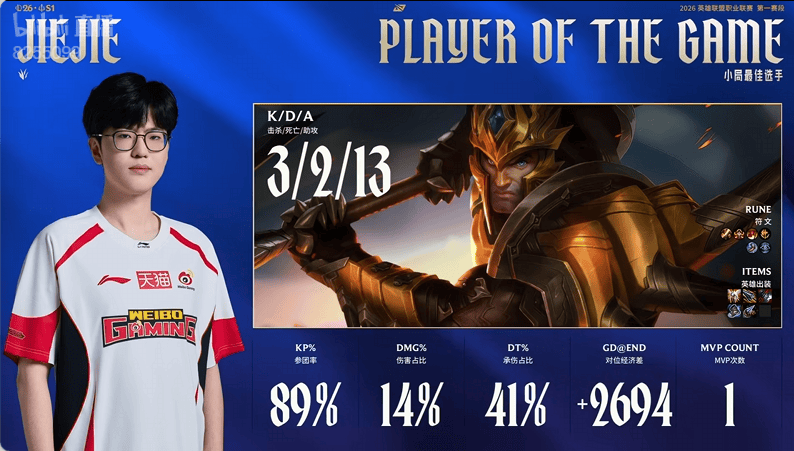 Jiejie皇子打出3/2/13战绩,拿到WBG对阵JDG首局比赛MVP