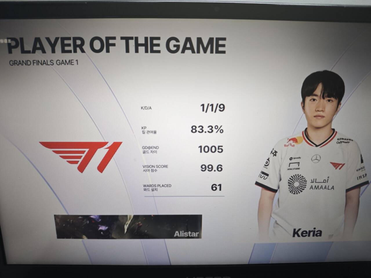 Keria牛头砍下1/1/9的战绩,拿下T1对阵HLE首局MVP