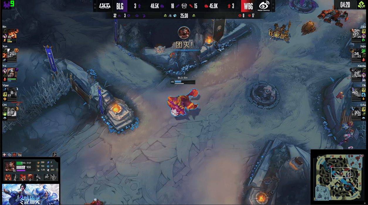 双方AD先后被秒,Bin与Yxl两人残局完美发挥打出团灭